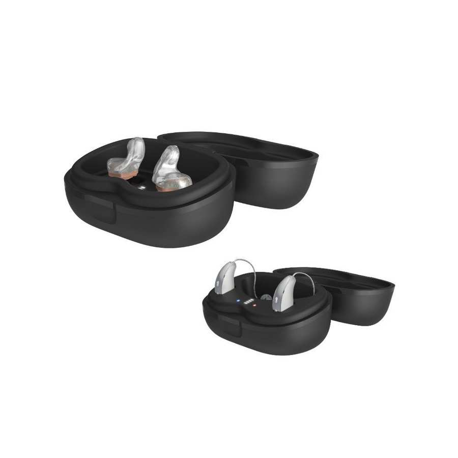 The rechargeable lithium-ion system eliminates disposable battery replacement and supports reliable all-day hearing on a single charge.